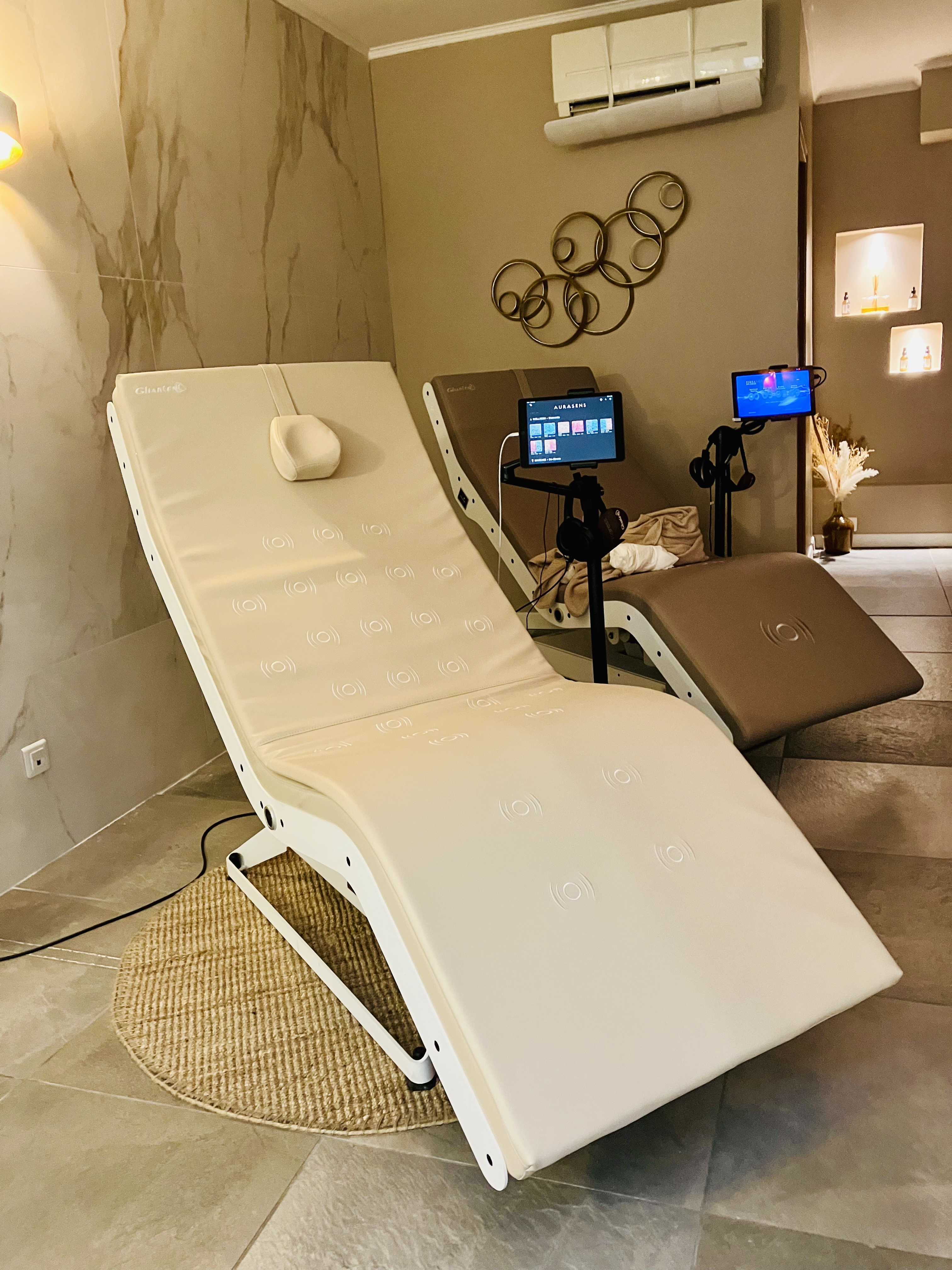 Le concept ? Une immersion sensorielle totale : bercés par des sons apaisants, nous plongeons dans une méditation douce, comme si on était au bord de l’océan ou près d’une rivière. Le fauteuil vibre légèrement, s’incline, et nous guide dans un voyage de relaxation d’une vingtaine de minutes. On se serait cru transportés dans un autre monde !