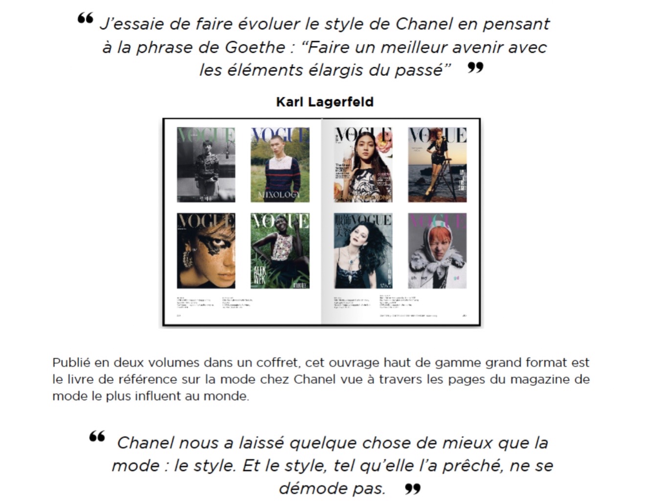 Voilà une publication qui devrait affoler la planète fashion et style…Chanel in Vogue est le premier ouvrage consacré à la maison Chanel et à ses créations présentées dans Vogue, avec illustrations et photographies emblématiques issues de l’histoire du magazine dans ses éditions internationales. Rebecca C. Tuite, co-auteure et historienne de mode réputée, le dit dans l’introduction du premier volume :« Considérer la présence de Gabrielle Chanel dans les pages de Vogue, c’est réfléchir à l’histoire parallèle et entremêlée de deux forces déterminantes de la mode du XX° siècle. Vogue et Chanel ont atteint leur maturité ensemble, avec une synchronisation remarquable dans leur développement. » Vogue a repéré le talent de la jeune Gabrielle Chanel dès 1910 et a continué à parler de la créatrice au fil des décennies, de sa célèbre petite robe noire, à ses plus luxueuses créations de haute couture. 1983, un tournant, une nouvelle vision de la marque imaginée par Karl Lagerfeld qui trouve sa place dans le prestigieux magazine, inspirant les plus grands stylistes et photographes internationaux dans les éditions de Vogue.