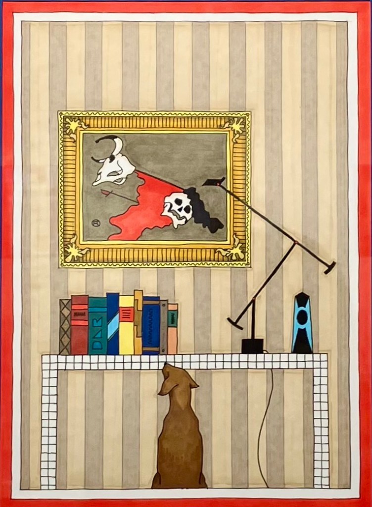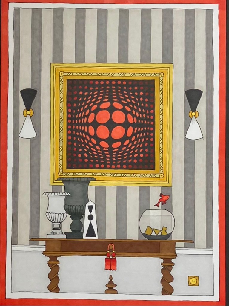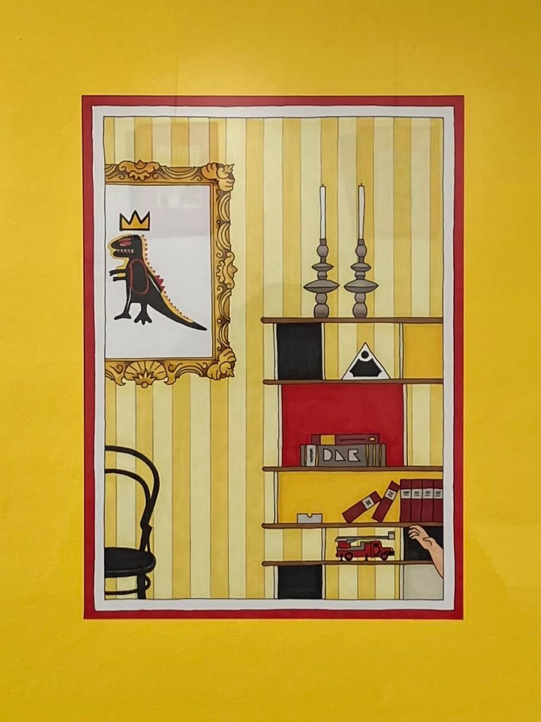 Avec “Portraits d’Intérieur”, Damien Nicolas Roux transforme la galerie en véritable terrain de jeu visuel. Son idée ? Imaginer des intérieurs fictifs construits autour d’œuvres modernes iconiques. Chaque illustration est truffée d’indices, de clins d’œil et de références cachées. Un motif coloré par-ci, une silhouette graphique par-là… Tiens, ça ne rappellerait pas Keith Haring ? Et ce détail, n’aurait-il pas un petit air de Jean-Michel Basquiat ? On observe, on hésite, on devine… L’exposition se parcourt comme un jeu de piste où chaque élément a quelque chose à raconter.