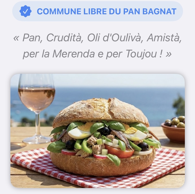 Sur leur site de la Commune libre du Pan Bagnat, le ton est donné: «Rassembler celles et ceux qui considèrent le pan bagnat comme un authentique trésor du patrimoine culturel et culinaire de notre belle ville de Nice. (…) Son symbole huileux étant un bastion attaqué de toutes parts par la salade verte, le maïs… et les hamburgers ! ».